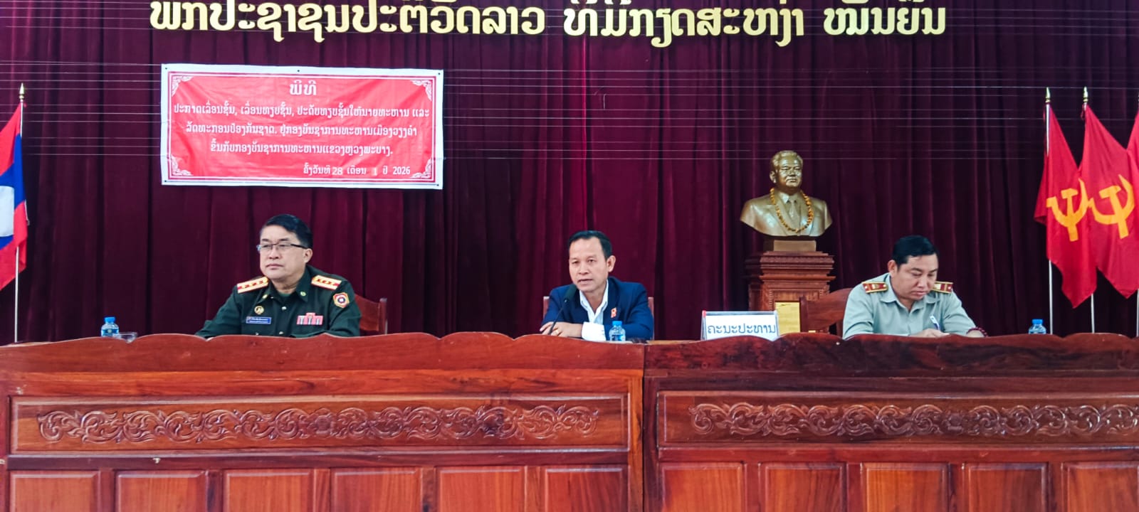 ພິທີປະກາດເລື່ອນຊັ້ນ, ເລື່ອນທຽບຊັ້ນ, ປະດັບຊັ້ນໃຫ້ນາຍທະຫານ ແລະລັດຖະກອນປ້ອງກັນຊາດຢູ່ກອງບັນຊາທະຫານເມືອງວຽງຄຳໄດ້ຈັດຂື້ນໃນວັນທີ 28 ມັງກອນ 2026 ຢູ່ທີ່ສະ ໂມສອນໃຫຍ່ຂອງເມືອງ. ໂດຍການເປັນປະທານຮ່ວມ ຂອງສະຫາຍ ສອນສັກ ສຸສິເສີມ ກຳມະ ການພັກແຂວງ, ເລຂາຄະນະບໍລິຫານງາຍພັກເມືອງ, ຫົວໜ້າຄະນະສະມາຊິກສະພາປະຊາຊົນແຂວງປະຈຳເມືອງ, ມີສະຫາຍ ພັນເອກ ວິລະສິນ ມິດຕະພອນ ຮອງກອງບັນຊາການ, ຫົວໜ້າຫ້ອງການເມືອງທະຫານແຂວງ, ສະຫາຍ ໄຊຍະວັນ ໄພບູນ ກຳມະການພັກເມືອງ, ຫົວໜ້າຫ້ອງ ການສຶກສາທິການ ແລະກິລາເມືອງ, ມີການນຳເມືອງ, ຄູອາສາສະໝັກຕະຫຼອດຮອດນາຍ ແລະພົນ ທະຫານເຂົ້າຮ່ວມ.